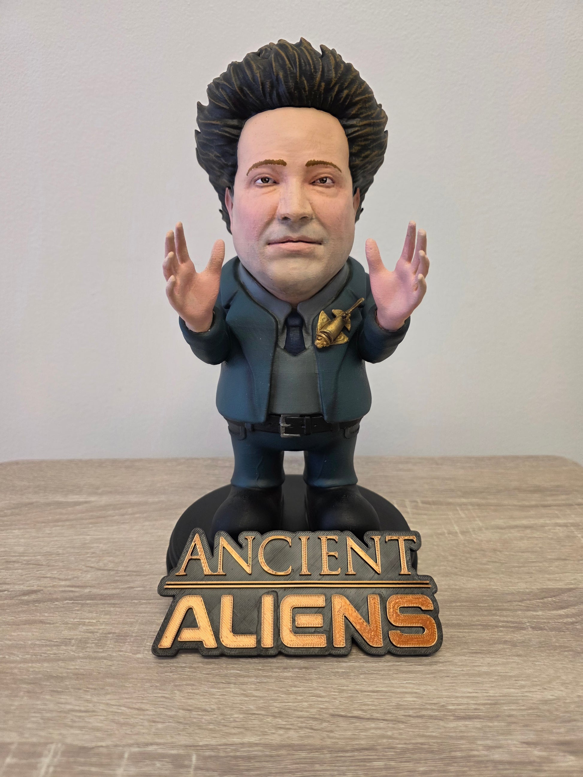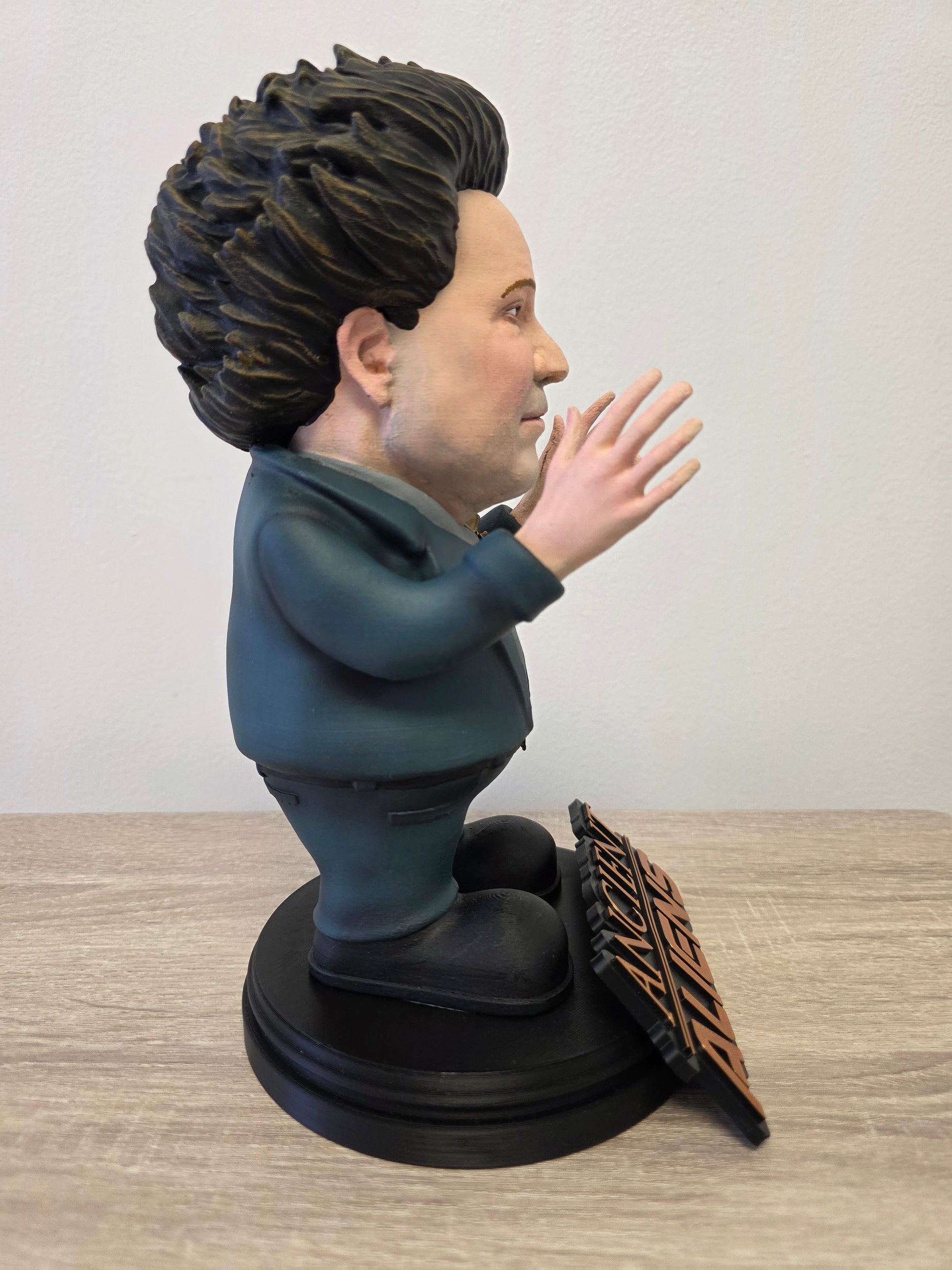 George Tsoukalos from the popular show Ancient Aliens, reimagined in our signature gnome style. This collectible stands just under 10 inches tall, measuring approximately